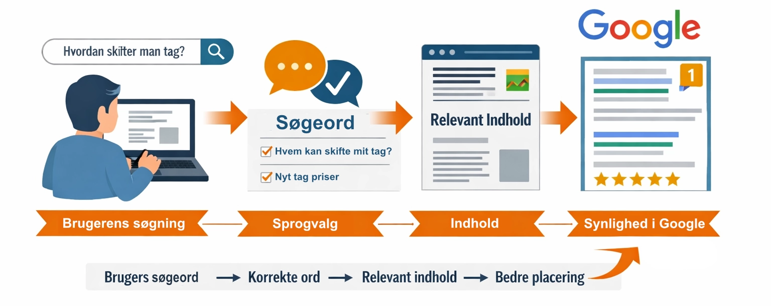 Det er vigtigt at forstå, at en søgeordsanalyse også er en sproganalyse. Virksomheder bruger ofte et andet sprog end deres kunder. Analysen hjælper med at afdække, hvilke ord, formuleringer og vendinger brugerne faktisk anvender, så indholdet kan skrives i et sprog, der føles naturligt og genkendeligt for målgruppen.